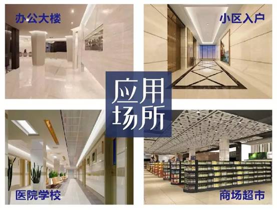凭借优异的产品性能与高性价比,特别适用大面积的公共区域,如办公大楼、商场超市、医院学校、小区入户及电梯间、安置房、家庭客厅装修等场所。